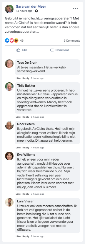 Ik heb astma en woon in een klein appartement zonder goede ventilatie. AirClairu liet de lucht binnen enkele uren merkbaar schoner aanvoelen. Ik piep ’s nachts niet meer.